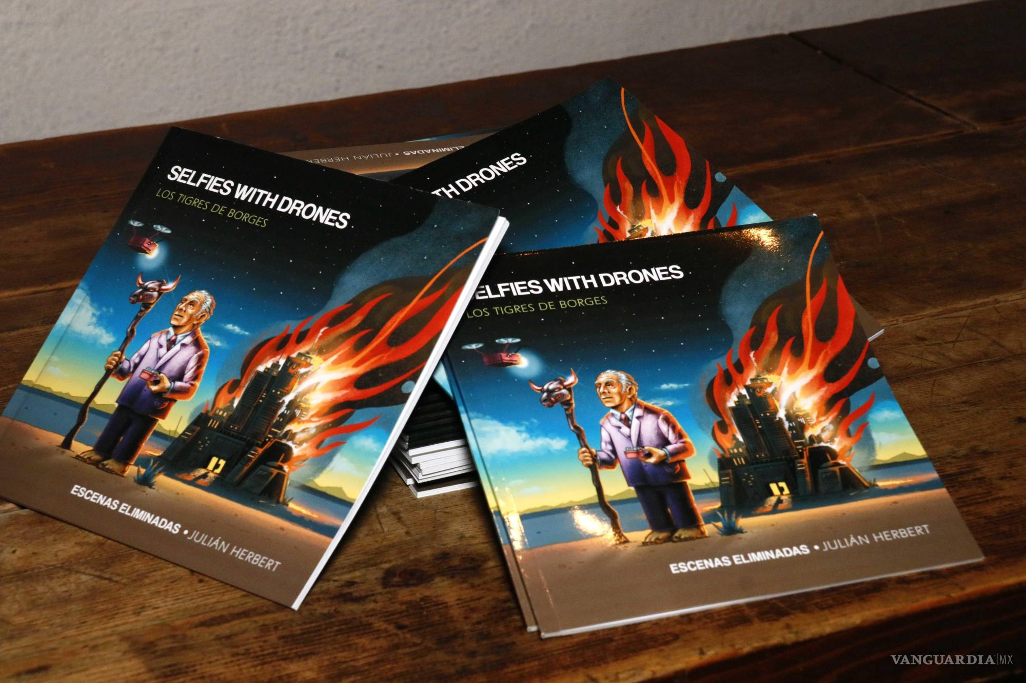 Este año el dúo Los Tigres de Borges lanzó su primer álbum de estudio “Selfies with drones”, una mezcla de ecléctica de lo musical y lo literario integrada por el escritor —y vocalista— Julián Herbert y el guitarrista Héctor Zárate. Pero esta naturaleza de juego, experimento y exploración no se iba a quedar en el estudio, por lo que a la par un producto paralelo.