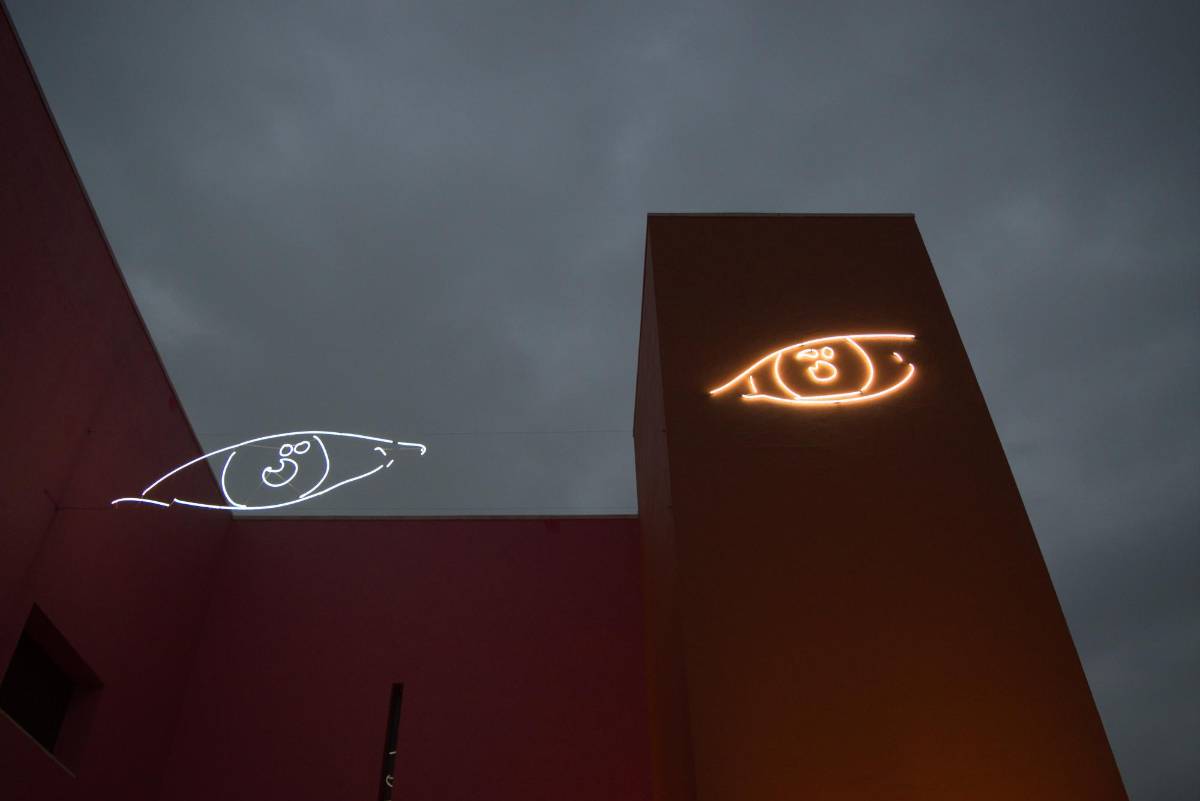 La otra pieza es “Complete Bliss Is Not a Full Reality” (La felicidad completa no es toda la realidad), un par de ojos dibujados con lámparas neón, los cuales corresponden a los de la celebridad Kim Kardashian en una de sus selfies y se pueden ver desde fuera del museo.