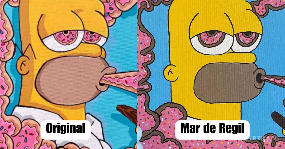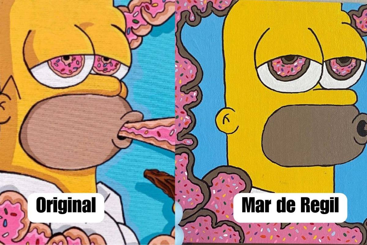 Basta una búsqueda sencilla para dar con muchas reproducciones, sobre todo en el sitio Etsy, de Homero Simpson fumando un cigarrillo de marihuana y expulsando humo con textura de donas glaseadas y chispitas de dulce. Es difícil determinar, dado que la imagen ha sido reproducida por más de un usuario en la plataforma, quién es el autor original, pero definitivamente reitera la vibra genérica que se le cuestiona al arte de Mar.