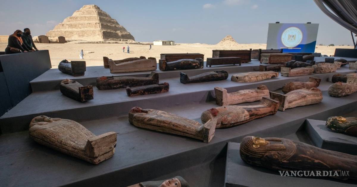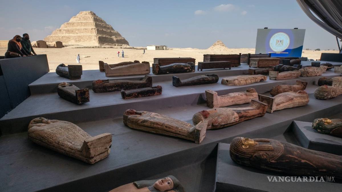 Los coloridos sarcófagos sellados y las estatuas, que datan de hace más de 2,500 años, fueron exhibidos al pie de la célebre Pirámide Escalonada de Zoser en Saqqara.
