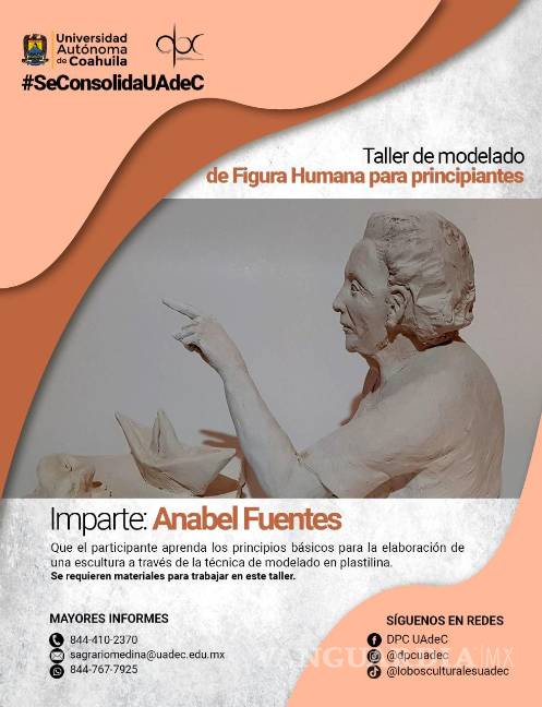 La maestra Anabel Fuentes estará a cargo del taller de modelado de figura humana para principiantes, que inicia el mismo día, en un horario de 16:30 a 19:30 horas, compartirá los principios básicos para la elaboración de una escultura en plastilina.