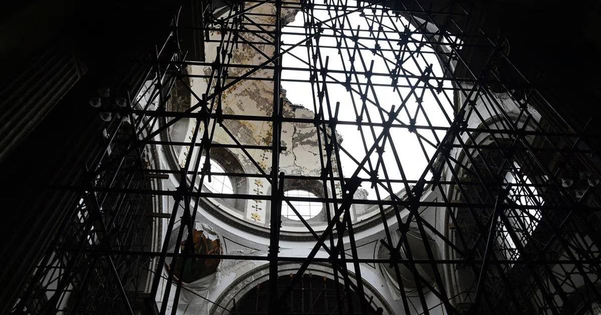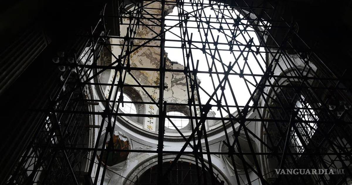 La cúpula, que es donde más fácilmente se observan los daños, pero también la estructura fue afectada. Mientras tanto los fieles asisten a los servicios religiosos en una rehabilitada el año pasado junto a la parroquia.