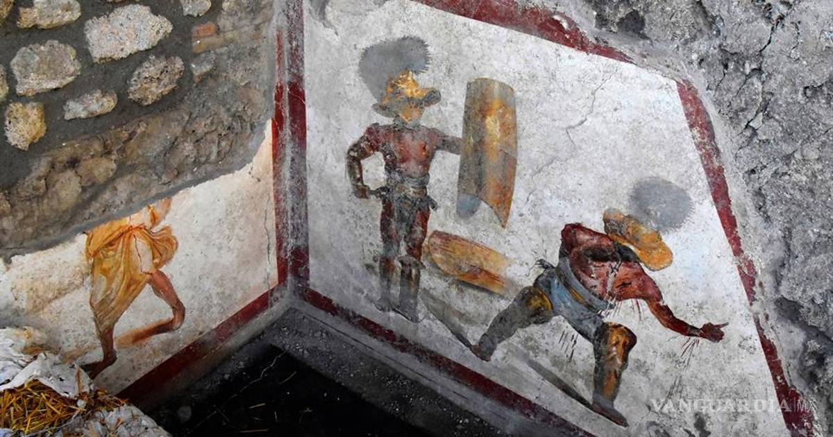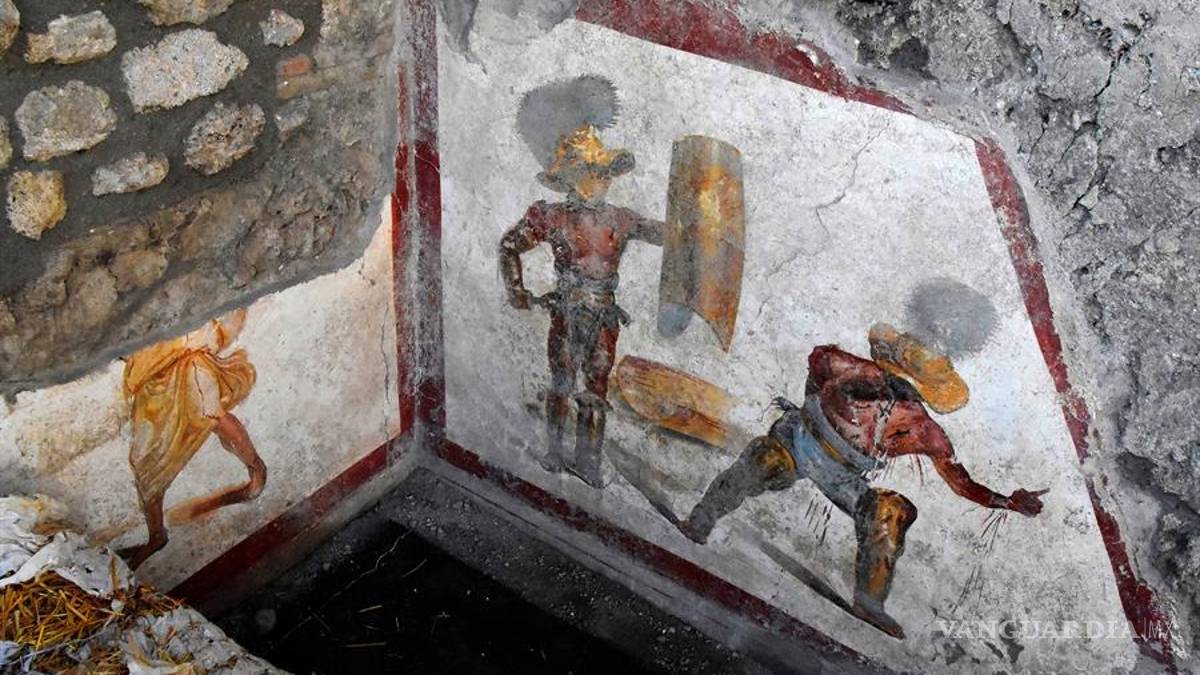 Un fresco que muestra la cruenta lucha de dos gladiadores, heridos y bañados en sangre, es el último hallazgo en las excavaciones del yacimiento de Pompeya (sur), la ciudad romana sepultada y arrasada por la erupción del Vesubio hace dos milenios.