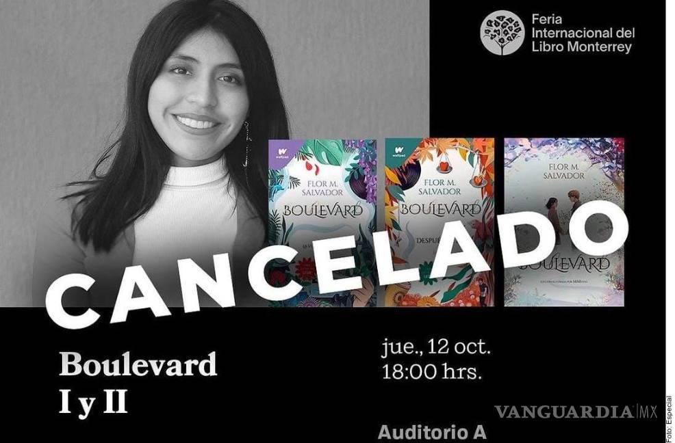 La presentación de la escritora mexicana Flor Salvador, conocida por sus libros Boulevard y quien estaría este jueves en la Feria Internacional del Libro Monterrey, fue cancelada.