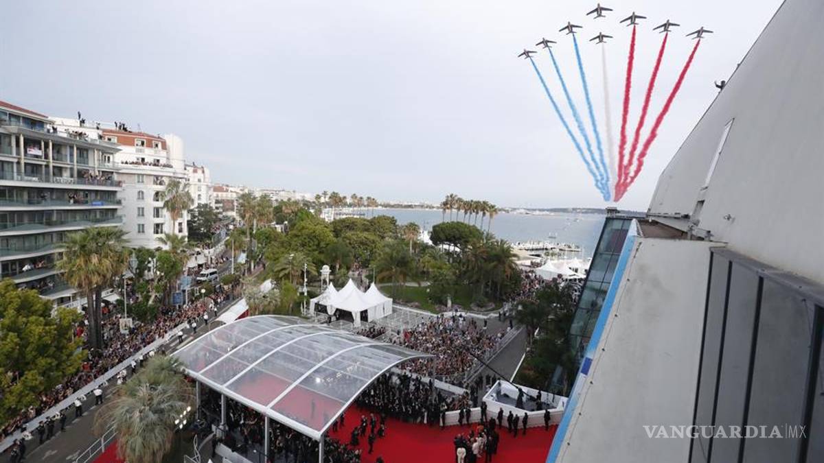 Ocho aviones de la Patrulla Aérea francesa, grupo acrobático del ejército, sobrevolaron el Palacio de Festivales de Cannes durante el desfile por la alfombra roja de Tom Cruise y el resto del equipo de “Top Gun: Maverick”.