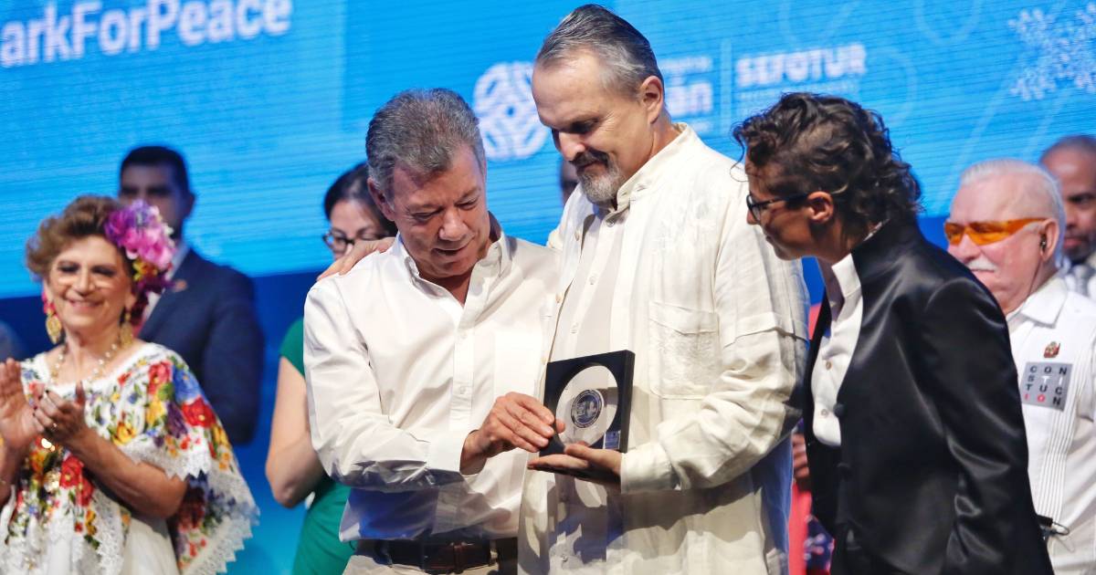 Después de estas palabras, Miguel Bosé subió al estrado para recibir el reconocimiento: “Gracias a Juan Manuel Santos, quien es familia. Gracias por este reconocimiento que va a viajar directamente a Ginebra, a la sede de mi fundación que se llama Paz sin Fronteras, esa fundación la creamos hace muchos años Juanes y yo, con el propósito único de alzar la voz, para que la PAZ, esa palabra tan pequeña y tan poderosa, tan odiada y tan amada al mismo tiempo, tuviese el espacio que merece. Y es una labor de todos los días, mi equipo y yo trabajamos todos los días por la PAZ, muchas horas dedicadas a ella.