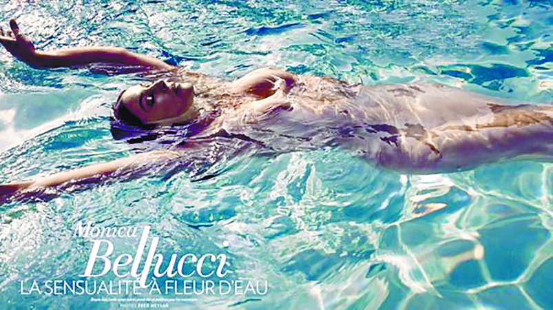 La diva italiana, que cumplirá 52 años el próximo 30 de septiembre, fue retratada para la portada de la revista francesa nadando sensual y relajadamente en una alberca.