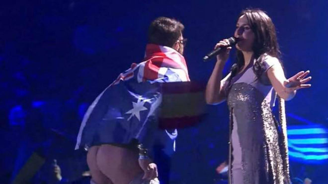 La gala de Eurovisión 2017 nos dejó varios momentos espectaculares y memorables, aunque no por las mismas razones. Una de estas fue la interrupción de uno de los espectadores cunado subió al escenario en medio de la actuación de la cantante Jamala, mostrando su trasero al desnudo.