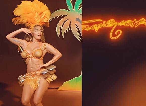La colombiana compartió un pequeño video promocional en sus redes, donde se ve luciendo un atuendo extravagante al estilo del cabaret cubano Tropicana, con un tocado de plumas, falda con flecos y caderas adornadas con timbales y un top con forma de maracas.