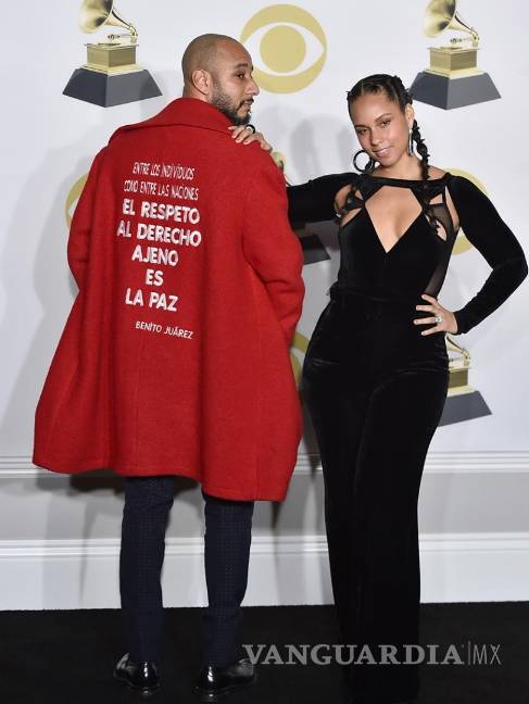El esposo de la cantante Alicia Keys, el productor neoyorquino de hip-hop Swizz Beatz, portó en la 60 edición de los Grammy un llamativo abrigo rojo con la famosa frase del otrora presidente de México, Benito Juárez.
