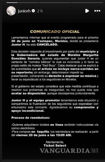 Una decisión tomada desde el gobierno de Morelos desató una nueva polémica en torno a la censura musical. El cantante Junior H anunció que su concierto programado para el 20 de junio en Yautepec fue cancelado, presuntamente por órdenes directas de la gobernadora Margarita González Saravia. De acuerdo con el comunicado emitido por su equipo, el motivo de la suspensión habría sido que el artista es considerado intérprete de “corridos bélicos”.