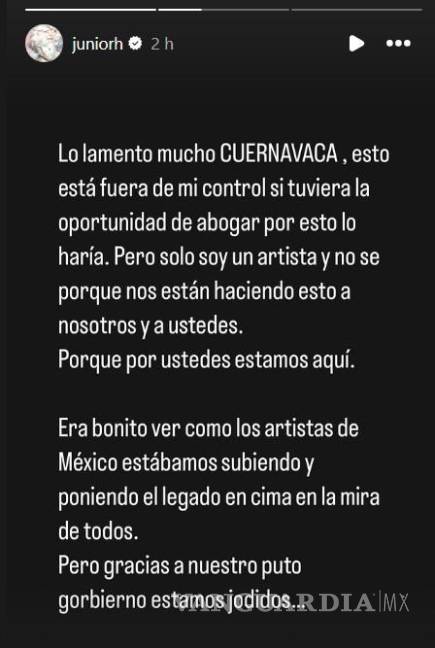 Junior H, por su parte, utilizó sus redes sociales para expresar su frustración por la cancelación: “Lo lamento mucho Cuernavaca. Esto está fuera de mi control. Si tuviera la oportunidad de abogar por esto, lo haría. Pero solo soy un artista y no sé por qué nos están haciendo esto a nosotros y a ustedes, porque por ustedes estamos aquí”, escribió.