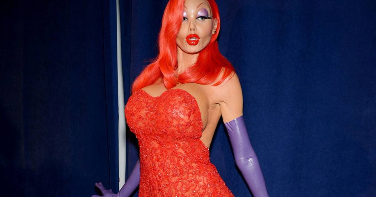 En las fotos de Facebook, se aprecia que la modelo de 42 años tuvo que usar máscara y prótesis para llegar a tener el volumen que tiene Jessica Rabbit.