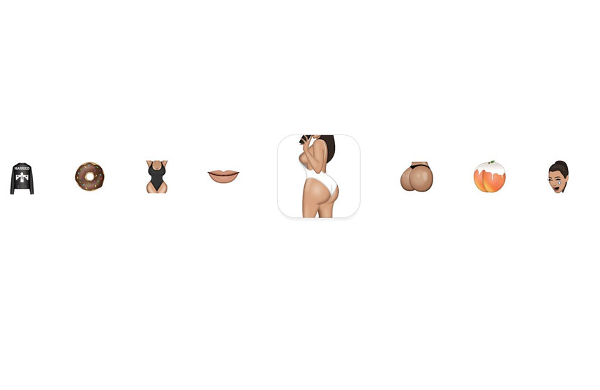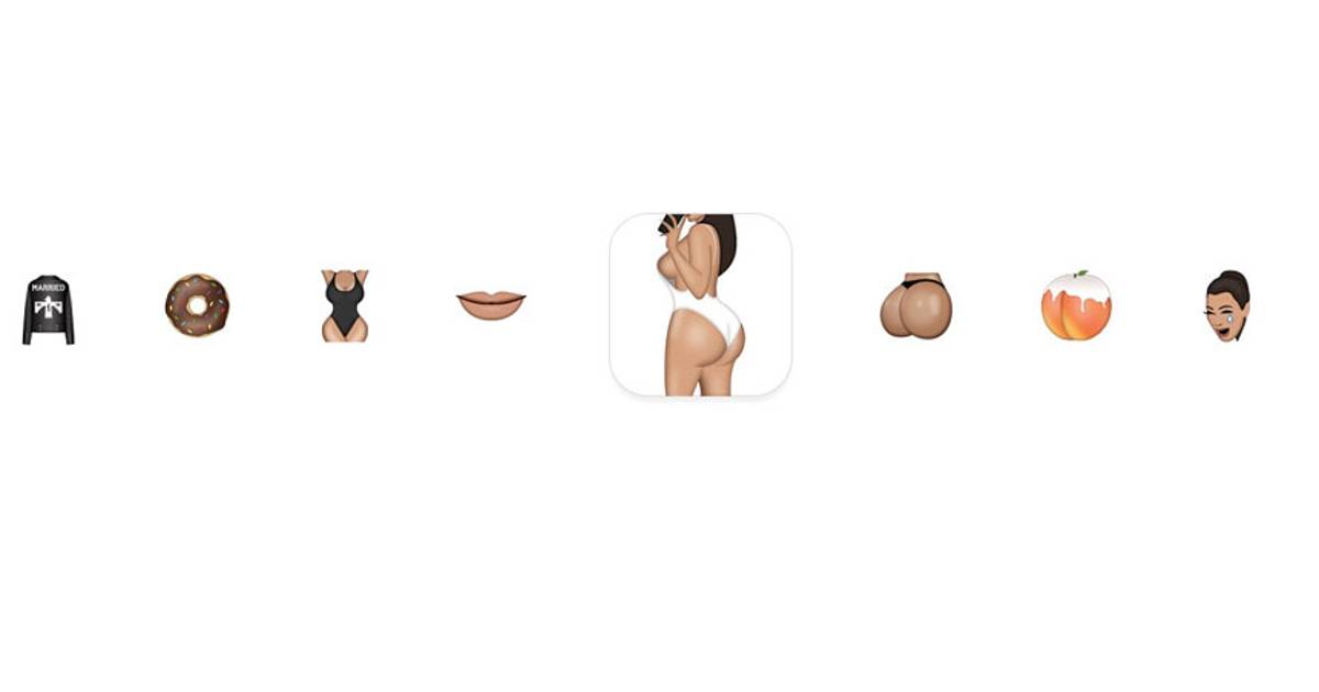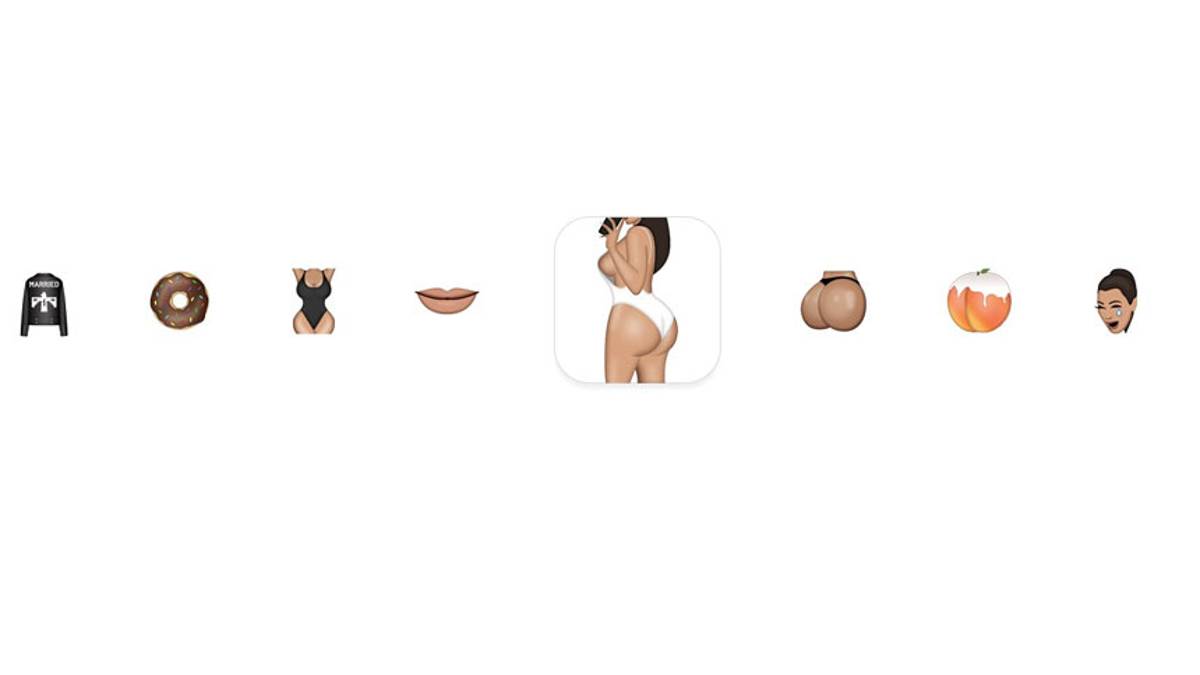 Kim Kardashian saca una selfie de su trasero; el elocuente trasero de Kim en primer plano; una uña con esmalte; un Rolls Royce; un secador de cabello; un pintalabios; una dona; ositos; un hoja de marihuana. Los objetos del universo Kardashian ahora integran una nueva colección de emojis que la estrella llamó Kimoji.