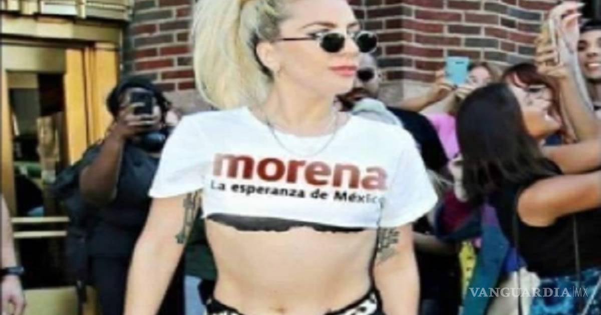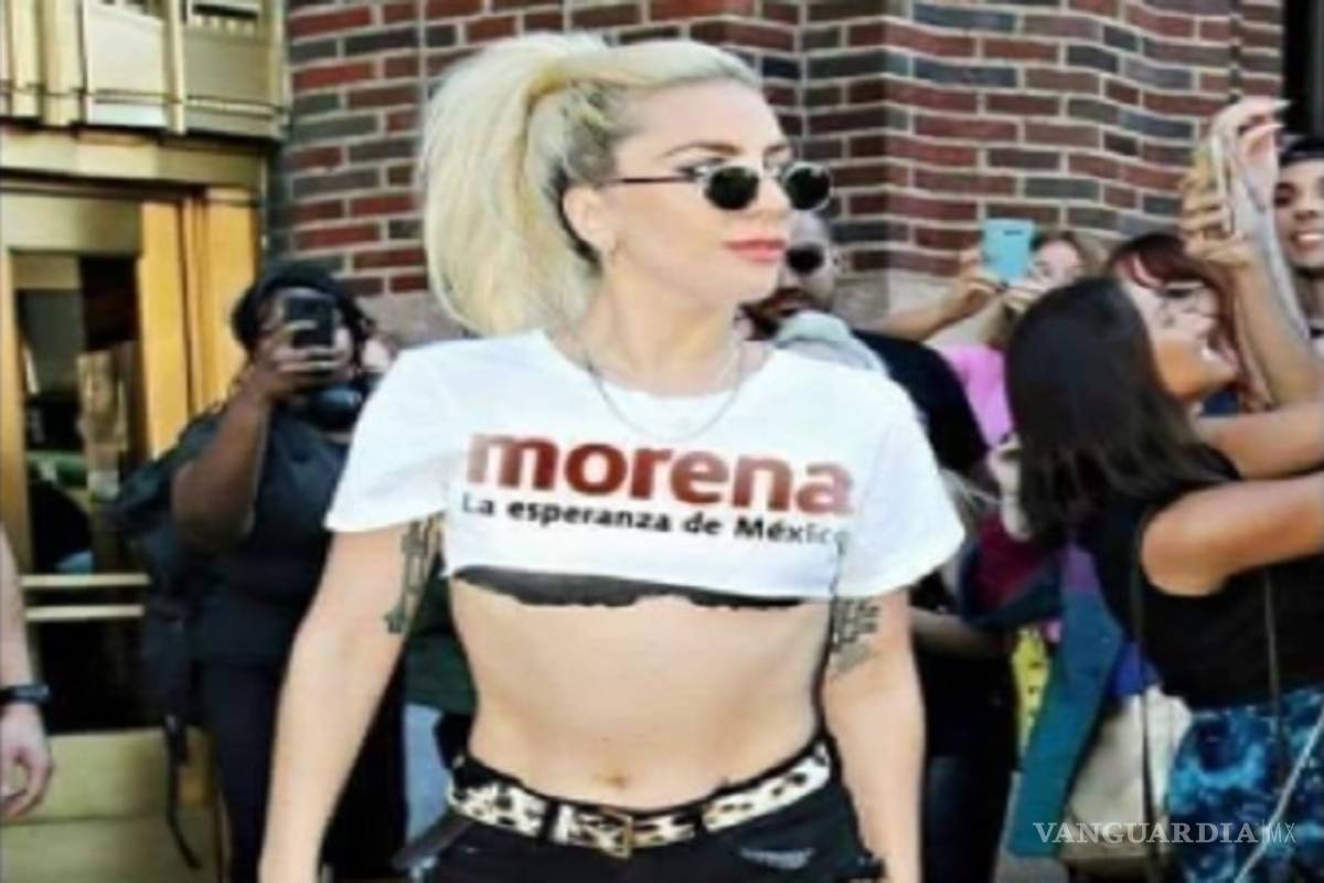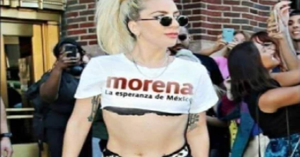 La imagen de la cantante Lady Gaga con una playera supuestamente con el logo de Morena empezó a circular en redes sociales, sin embargo, poco después se confirmó que se trataba de una “fake news”, pues la compositora estadounidense no ha manifestado su respaldo ni al partido, ni al presidente Andrés Manuel López Obrador, por lo que se trataba de una foto que se modificó.