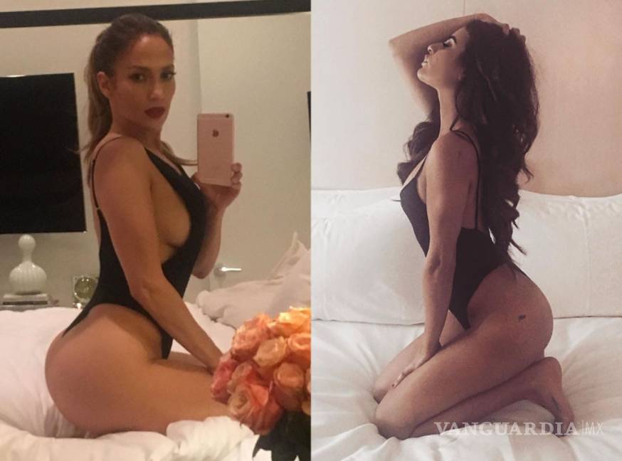 La fotografía de López también inspiró a Lea Michele. Lestrella de “Glee” parece imitar a JLo en la imagen, pues ella se arrodilla en la cama y deja a la vista parte de sus glúteos con una prenda casi exacta a la que lleva Jennifer Lopez en su autofoto hot .