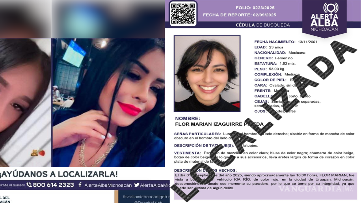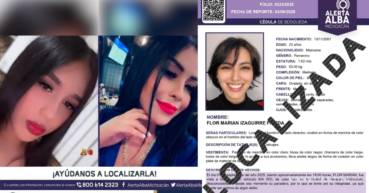 La Fiscalía General del Estado (FGE) de Michoacán informó el sábado 6 de septiembre que fue localizada con vida la influencer Flor Marian Izaguirre Pineda, quien había sido reportada como desaparecida el pasado 1 de septiembre en Uruapan.