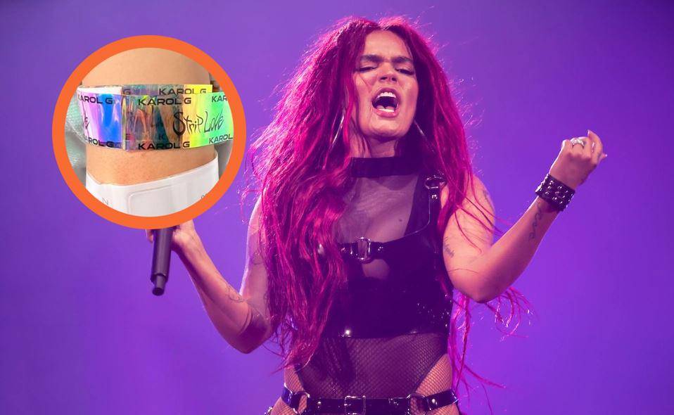 Karol posteó una foto del brazo de la mujer, que así como tenía los brazaletes del hospital, también portaba el del concierto de la colombiana.