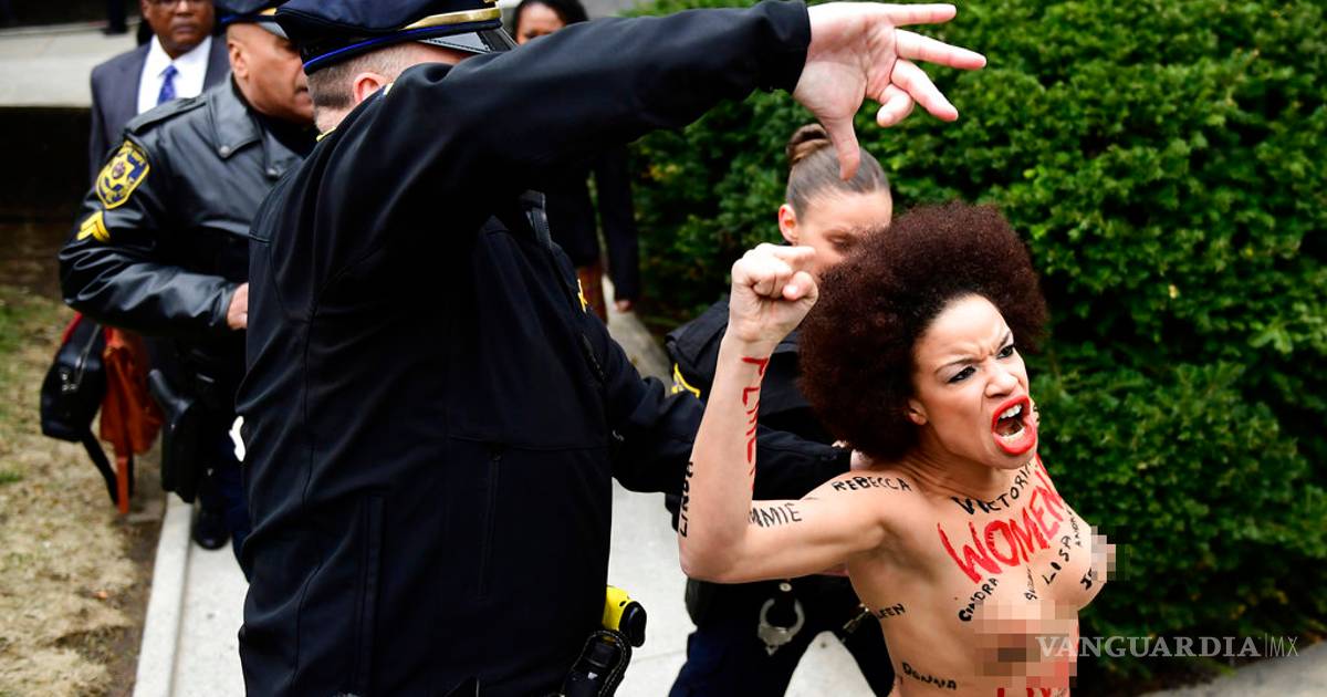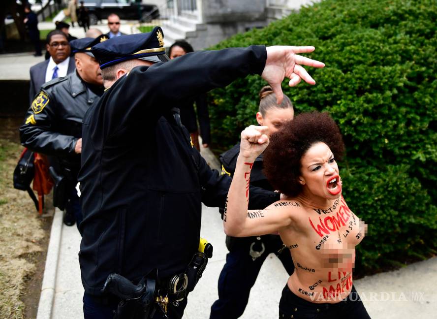 NORRISTOWN, Pennsylvania, EU. Una manifestante topless con las palabras "Women's Lives Matter" (Las vidas de las mujeres importan) escritas en su cuerpo saltó una barricada y llegó a estar a pocos metros de Bill Cosby este lunes, mientras el comediante caminaba hacia una corte en un suburbio de Filadelfia para el inicio de su nuevo juicio por abuso sexual.