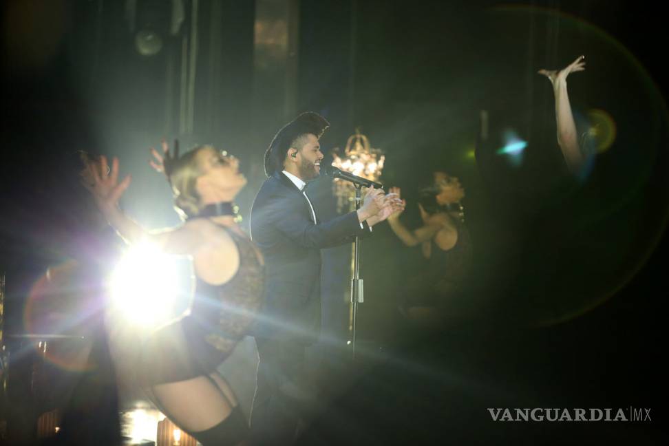 Acompañado de un cuerpo de bailarinas vistiendo lencería, The Weeknd interpretó la canción de 50 Sombras de Grey, "Earned It", que viene de ganar el premio Grammy a Mejor Canción de R&B.