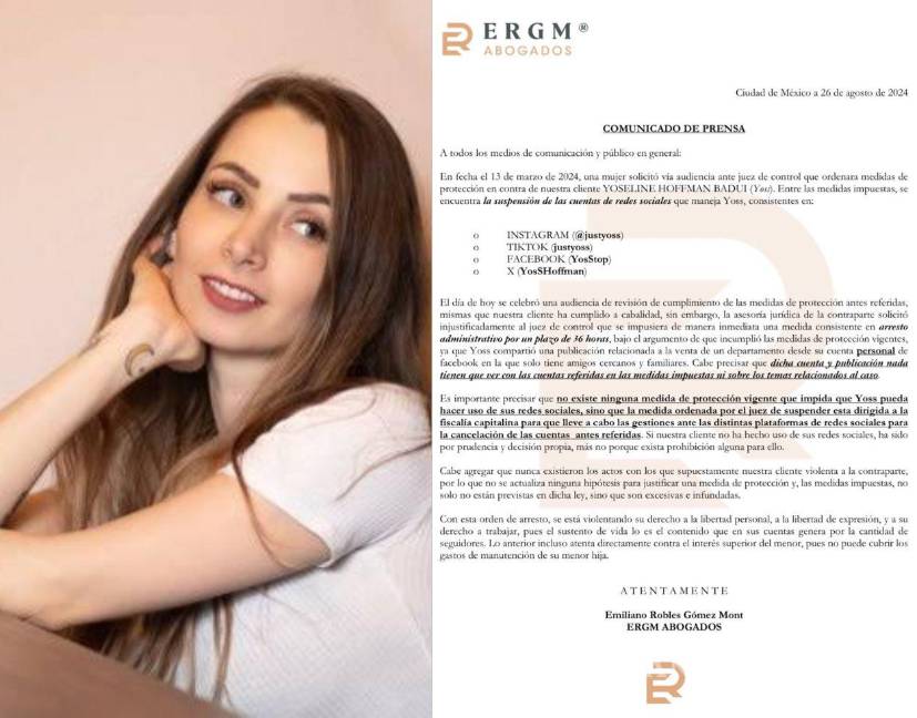 Firmado por el abogado Emiliano Robles Gómez Mont, el oficio explicó una parte del historial del caso contra YosStop: “En fecha el 13 de marzo de 2024, una mujer solicitó vía audiencia ante juez de control que ordenara medidas de protección en contra de nuestra cliente Yoseline Hoffman Badui (Yoss)”.