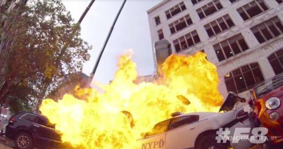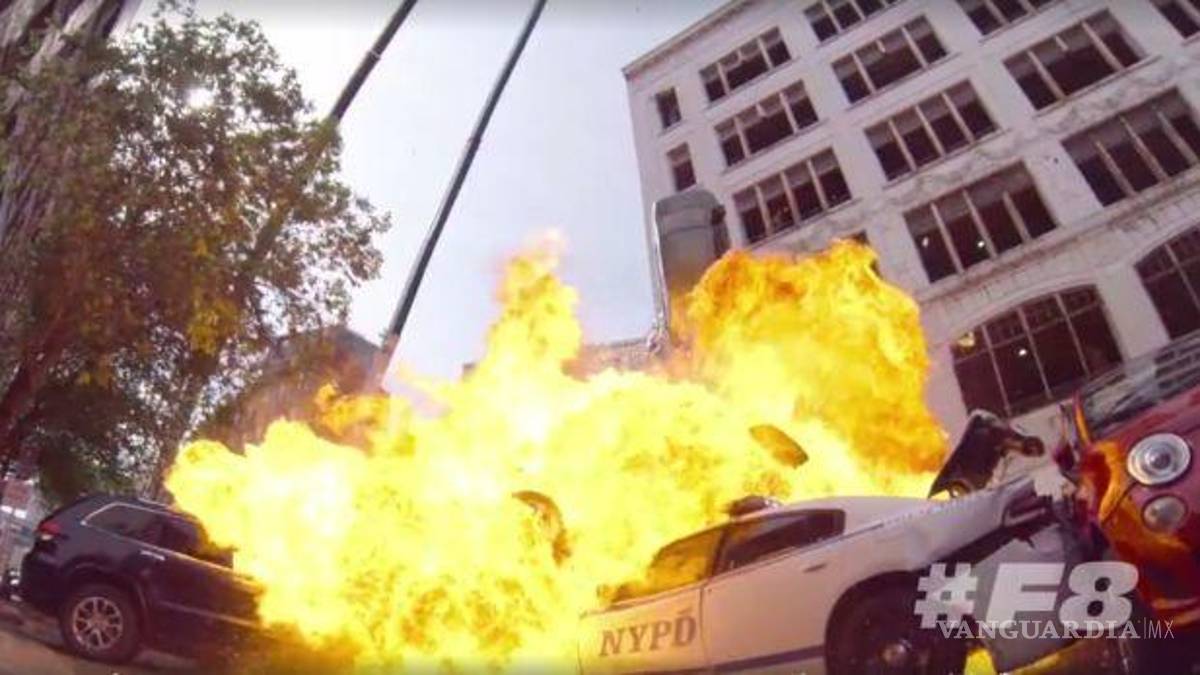 En la escena correspondiente de "Rápidos y Furiosos 8", varios carros deben caer desde la parte superior de un edificio. Los vehículos explotan y causan un gran desorden en las calles.