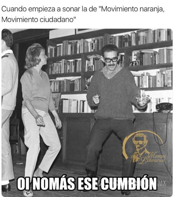 El favorito de los intelectuales Aunque muchos se esfuercen en hacer distinciones entre alta y baja cultura, lo cierto es que el spot de Movimiento Ciudadano ha permeado todos los sectores. Así, podemos ver a Albert Camus y a Gabriel García Márquez bailando este ritmo viral gracias a fan pages como la de Memes Literarios.