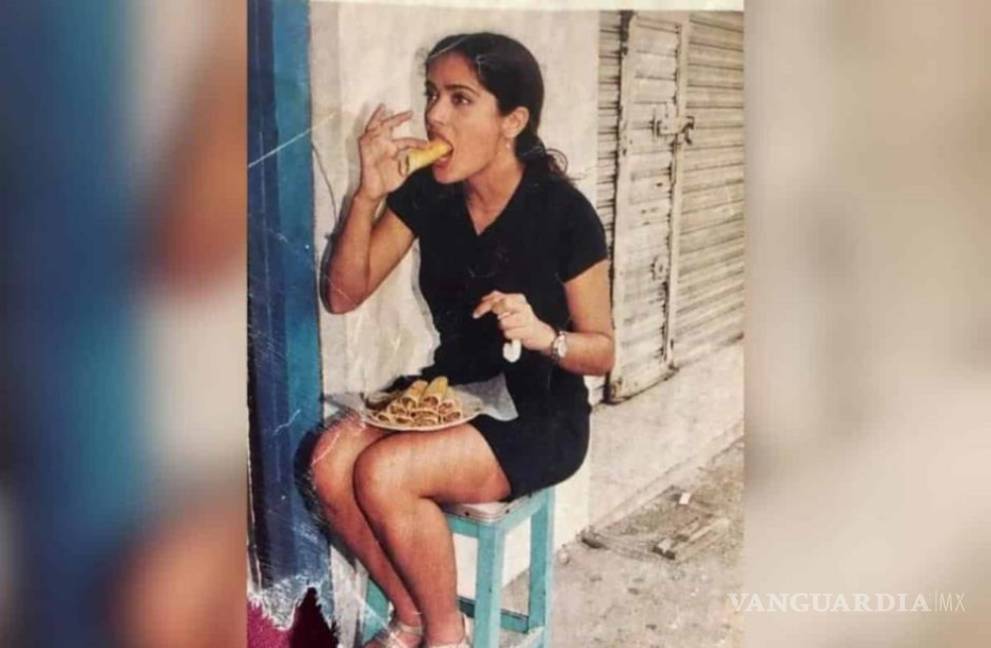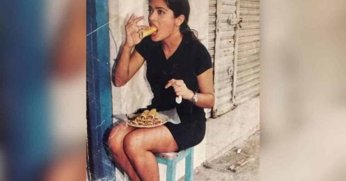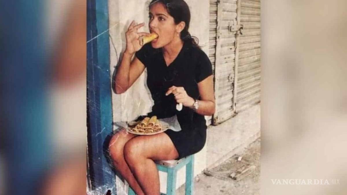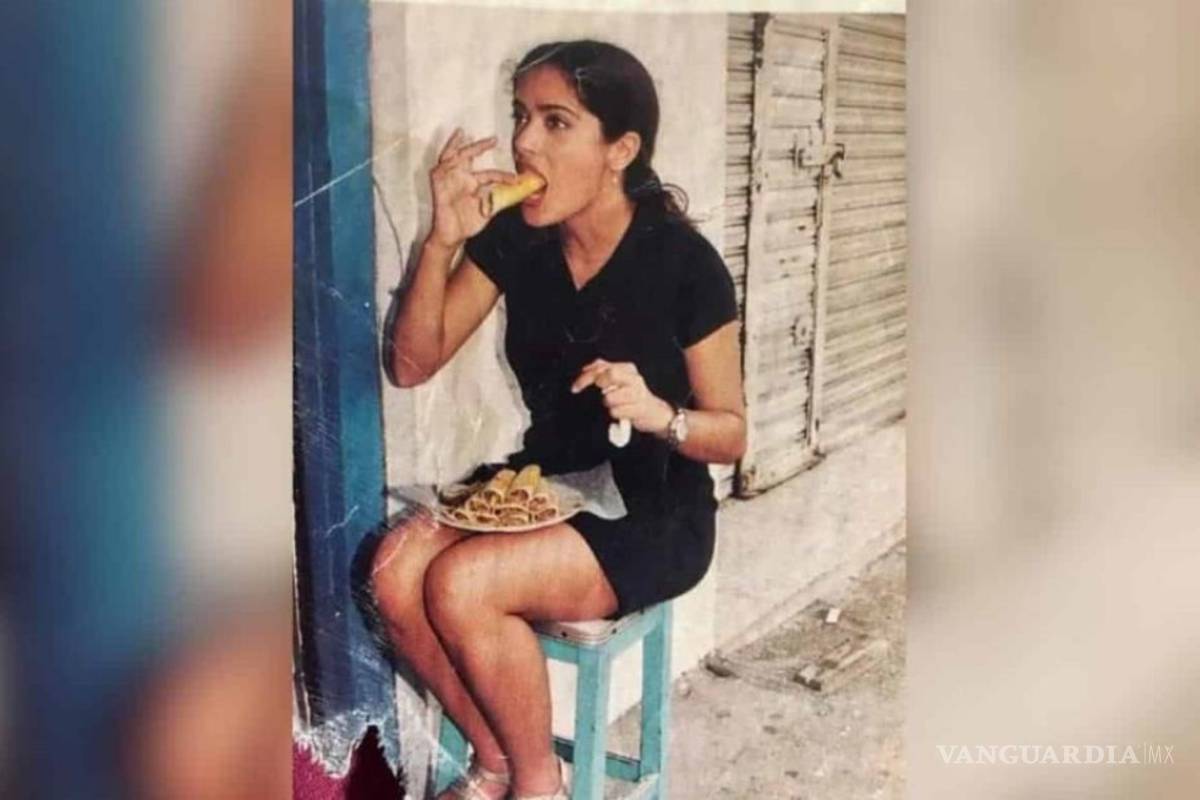 El usuario de Twitter @raflescabrera compartió una fotografía, seguramente de la década de los 90, donde se puede ver a una joven Salma vestida con un sencillo vestido negro y unos huaraches, sentada en la calle sobre un banco y a punto de morder un taco, mientras en sus piernas descansa un plato con otros nueve esperándola.