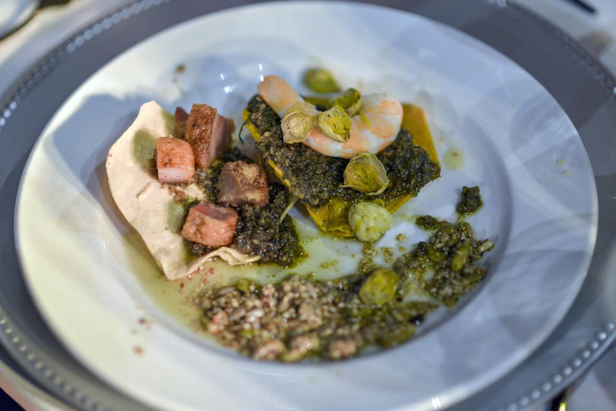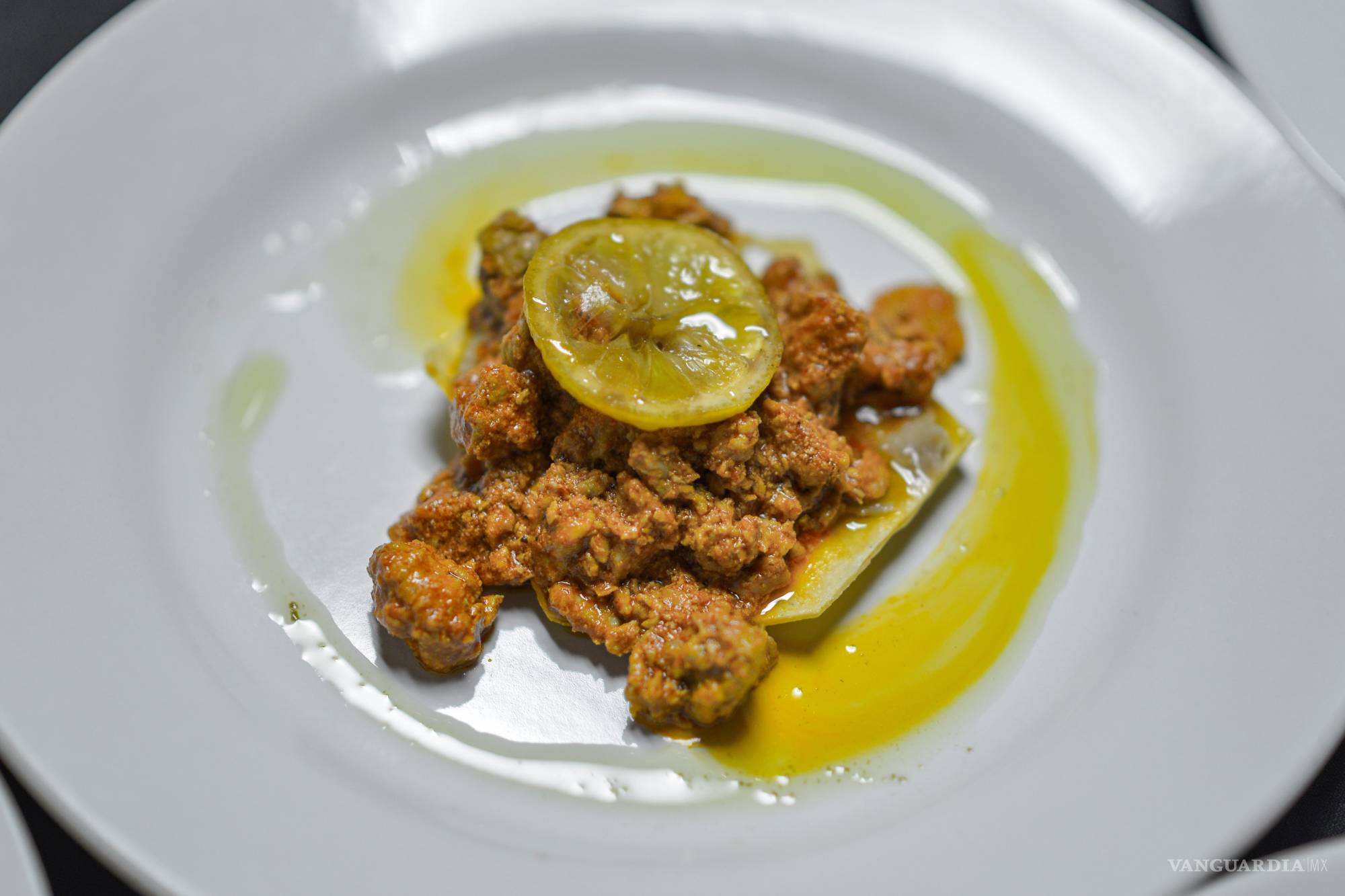 Para continuar con la sorpresa, sirvieron una tostada bautizada como Landín. Era roja con frijoles refritos, asado de boda y un limón asado amarillo, maridado con un vino tinto llamado Corvus, de la uva Syrah (la uva más antigua registrada en el mundo y la única mencionada en la Biblia).
