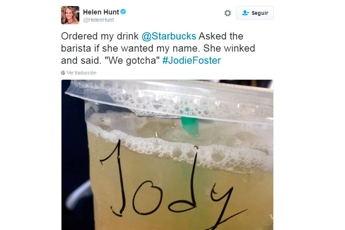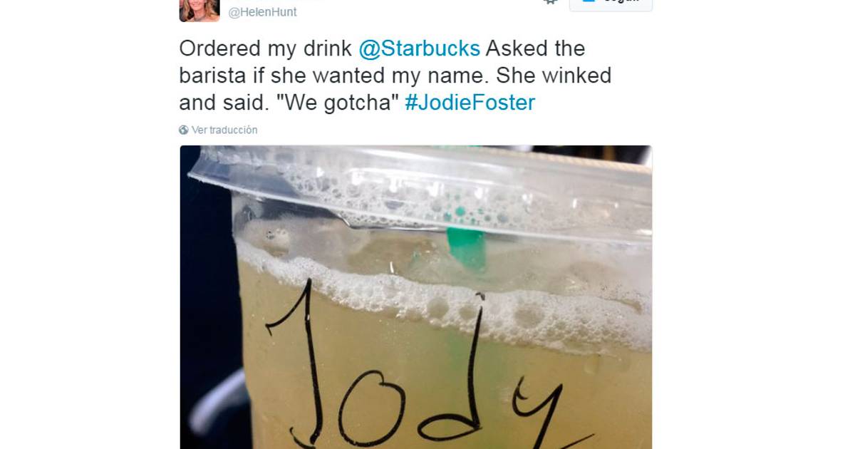 Hasta ahí parecía una escena normal en la vida de Hunt, acostumbrada a que sus seguidores la reconozcan por la calle o en lugares públicos. Sin embargo, su sorpresa fue mayúscula cuando leyó en su vaso la leyenda: "Jody", en obvia referencia a su colega Jodie Foster.