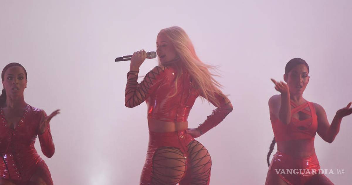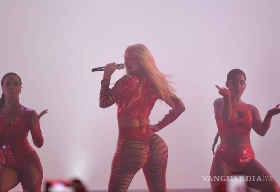 Iggy apareció y deslumbró en los Premios Juventud con unos leggins de látex rojo, un crop top del mismo material y unos botines altos negros con rojo rodeada de seis bailarinas con el mismo look.