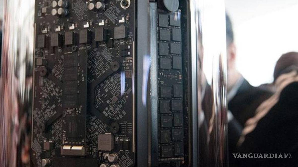 La funda pulida del cilindro se puede quitar para poder ver la construcción interior. Sobre la platina principal se encuentra un Intel Xeon E5 de la nueva generación que se puede pedir con cuatro, seis, ocho o 12 núcleos en un chip. Tests comparativos han demostrado que la nueva Mac Pro, en cuanto al rendimiento de coma flotante, es hasta dos veces más rápida que la vieja Mac Pro.
