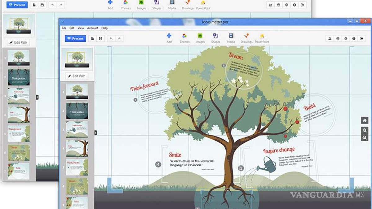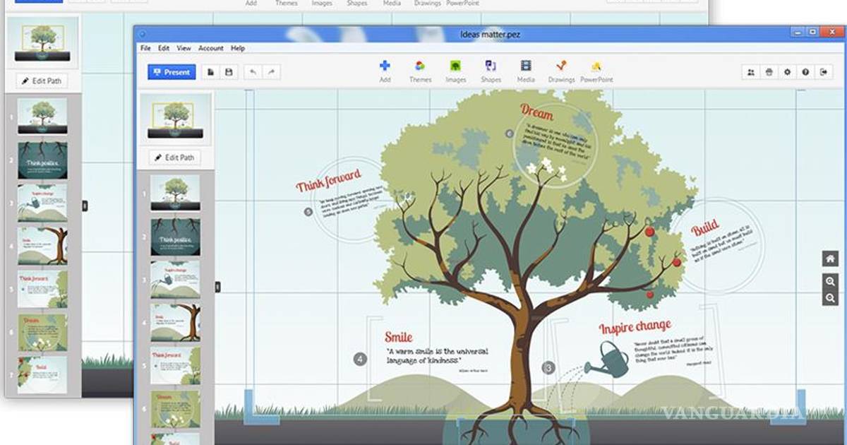 -La plataforma es intuitiva y no se necesitan muchos Conocimientospara hacer exposiciones atractivas. Se puede comenzar con plantillas en blanco o predeterminadas desde las metafóricas, con temas de árboles o caminos, hasta las empresariales con planes de mercado y presentaciones anuales.