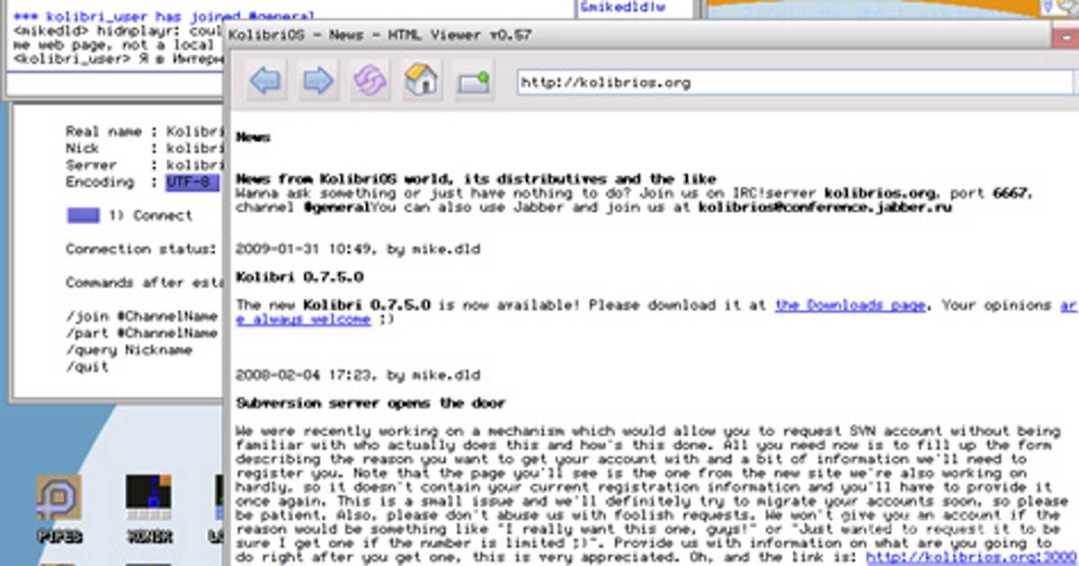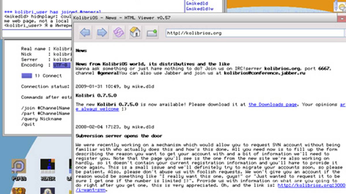 KolibriOS es un montaje de MenuetOS. Al igual que MenuetOS, es libre, de código abierto y se puede ejecutar desde un disco floppy, pero también es capaz de expandirse para satisfacer necesidades más grandes en una instalación de disco duro. Mientras Kolibri y Menuet son similares, cada una tiene una filosofía de interfaz de usuario diferente. Son igualmente capaces, a su manera. http://www.kolibrios.org/