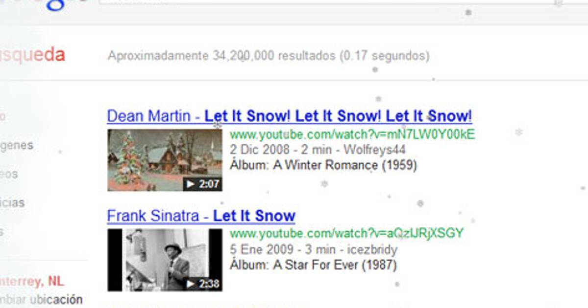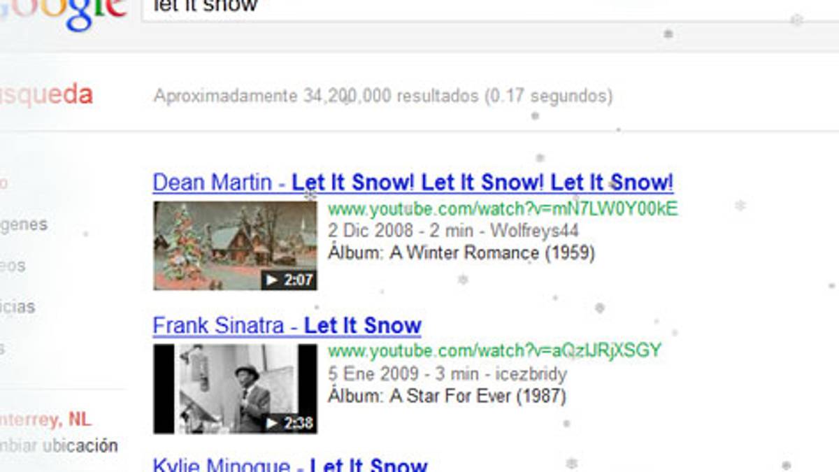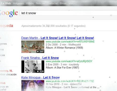 Al escribir en la barra de búsqueda las palabras "Let it snow" ("Deja que nieve"), la nieve se apodera de la página y comienza a caer, cubriendo de blanco la página de resultados.
