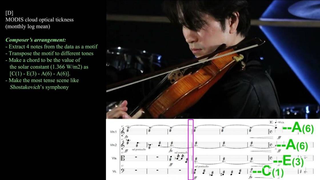 El compositor japones da dos ejemplos de lo anterior; “Daniel Crawford quien compuso “A Song of Our Warming Planet” y “Planetary Bands, Warming World” “en las que se generan notaciones a partir de cambios de temperatura atmosférica durante los últimos 133 años” y Lee de Mora quien es el compositor de “Earth System Allegro” que fue creada a partir de muchas datos físicos derivados de un modelo climático global”.