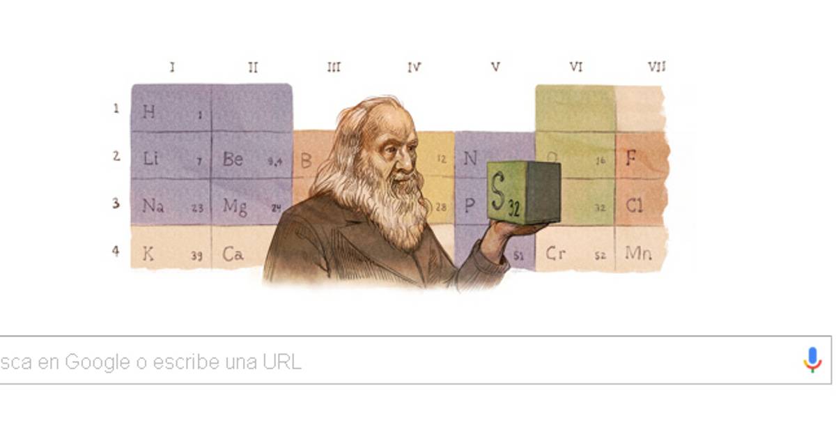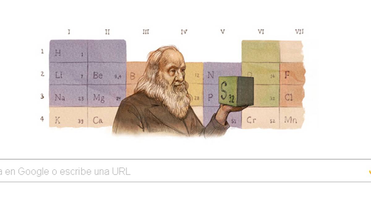 Con la excusa del 182º aniversario de su nacimiento, el popular buscador Google rinde tributo a Mendeléyev. Para la ocasión se ha personalizado el Doodle ilustrando al químico con el componente del Azufre en la mano y con una de las primeras tablas periódicas detrás.