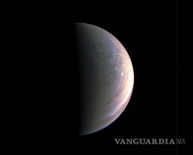 Asimismo resaltó que “no hay ninguna señal de las bandas latitudinales o cinturones que estamos acostumbrados a ver — esta imagen apenas es reconocible como Júpiter. Estamos viendo señales de que las nubes tienen sombras, lo que indica que se encuentran a una altitud superior a las demás características”.