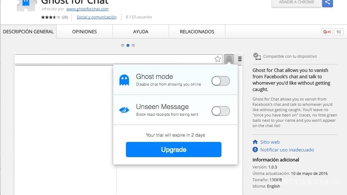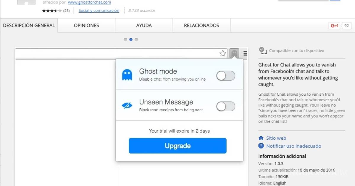 Puedes activarla directamente desde este enlace o ingresar a la barra de “Chrome Web Store” y buscarla como “ghost for chat”. Luego de descargarla, habrá que iniciar sesión en la cuenta de Facebook para activarla.
