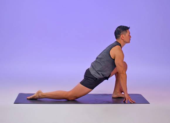 Desde la parte inferior del enrollamiento espinal hacia abajo, dobla las rodillas y coloca las manos sobre la esterilla, por fuera de los pies. Da un paso con el pie izquierdo hacia la parte posterior de la esterilla en una estocada, manteniendo la rodilla derecha asentada sobre el talón. Puedes mantener la rodilla izquierda levantada o colocarla sobre la esterilla. Mantén la posición durante dos respiraciones. Repite la postura en el otro lado. Después de la última estocada baja, sube a la parte superior de la esterilla y dobla la parte superior del cuerpo sobre las piernas.