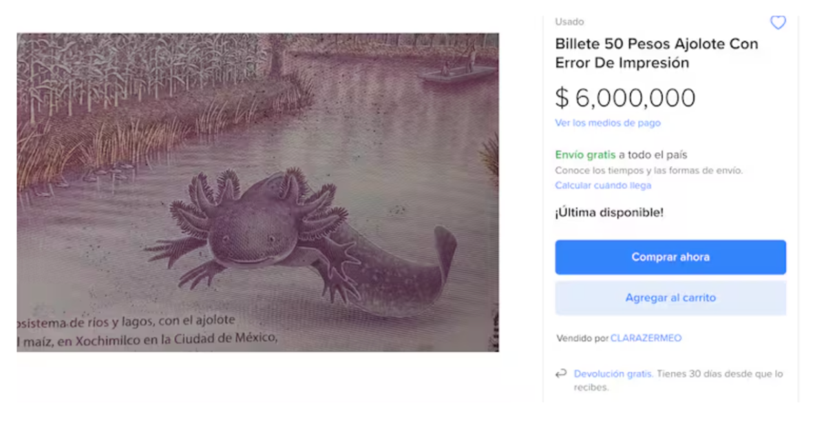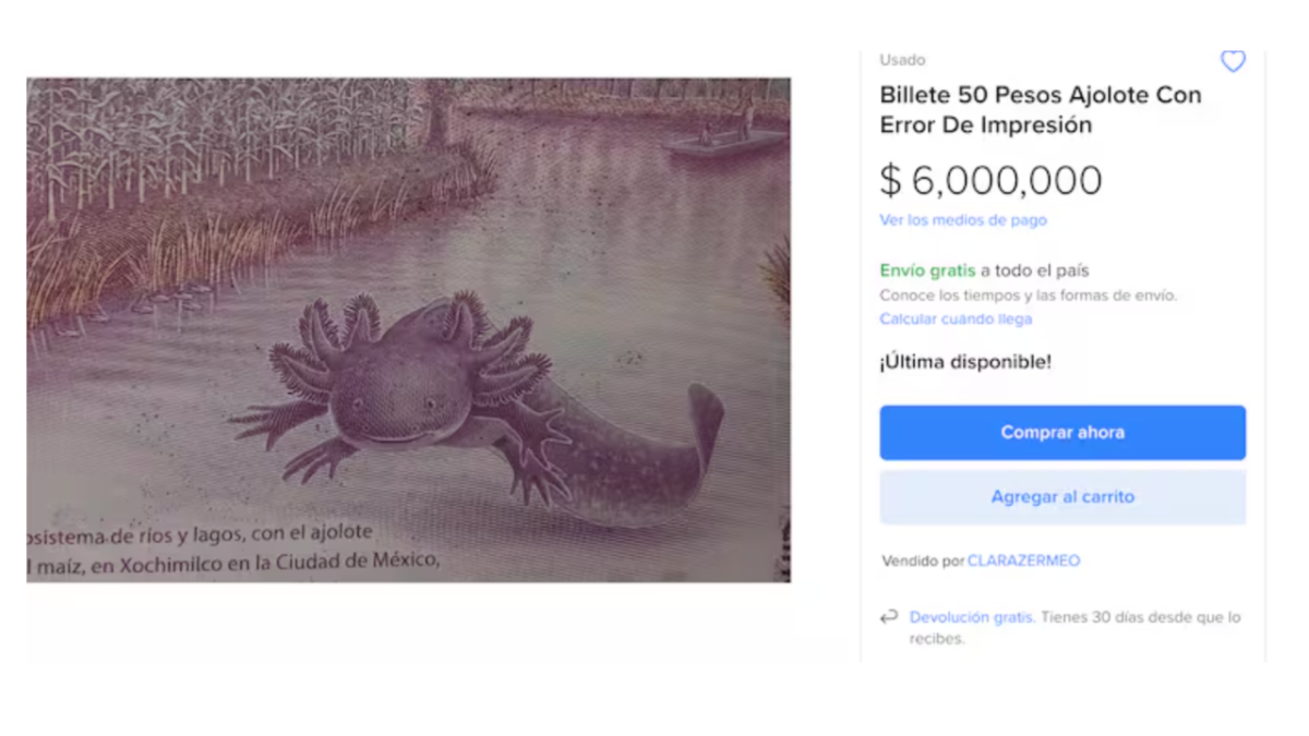 La numismática, que es el estudio de monedas y billetes antiguos y modernos, convierte piezas aparentemente comunes en artículos de colección. Factores como la impresión, material, diseño o número de serie pueden hacer que un billete se vuelva extremadamente deseable entre los coleccionistas. Y en este caso, se trata de un billete con la icónica imagen del ajolote que presenta errores de impresión, un factor que lo hace único.