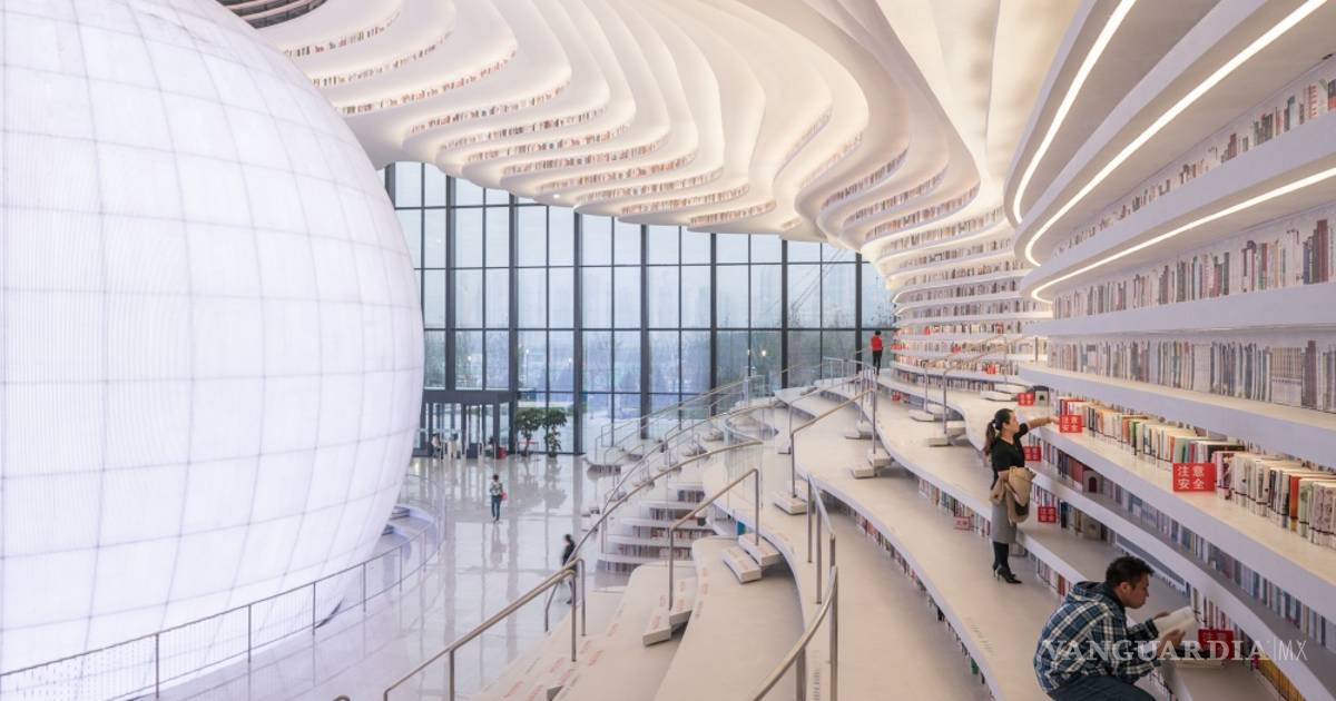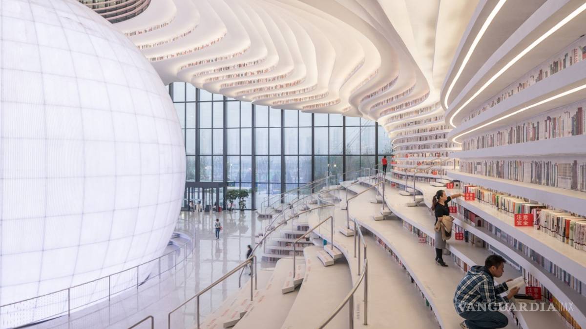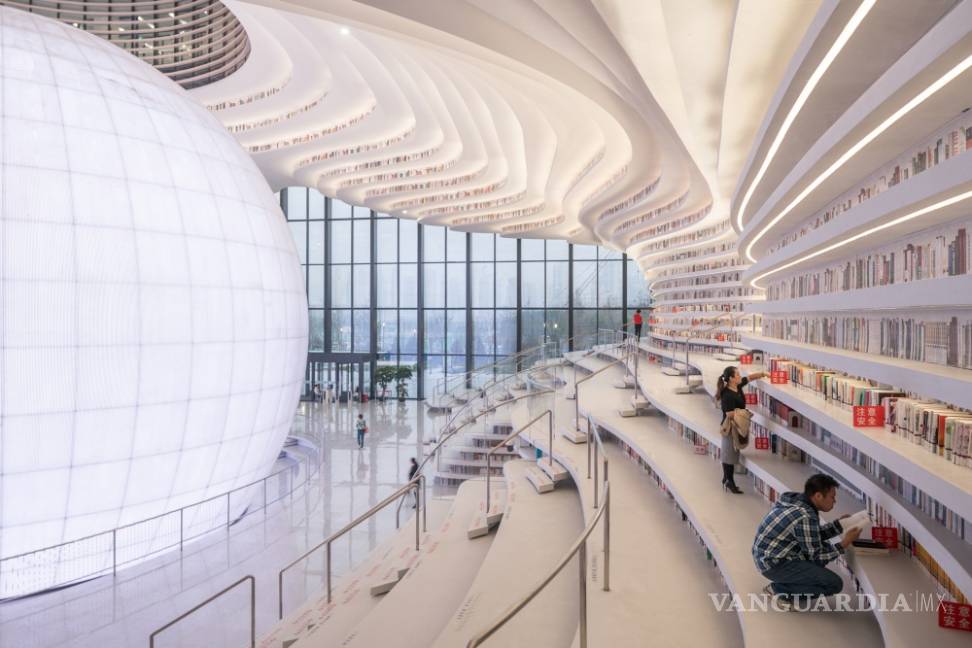 La espectacular biblioteca de la ciudad china de Tianjin tiene en su centro un auditorio esférico, paredes con cascadas ondulantes de estanterías, que contienen 1.2 millones de libros. Ya se la conoce como la biblioteca del futuro.