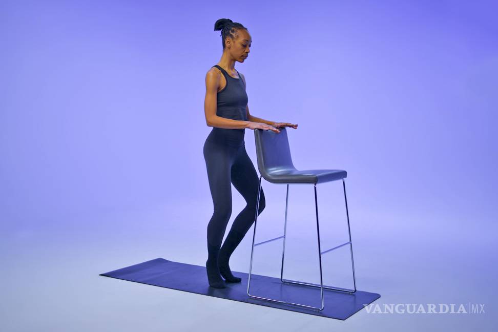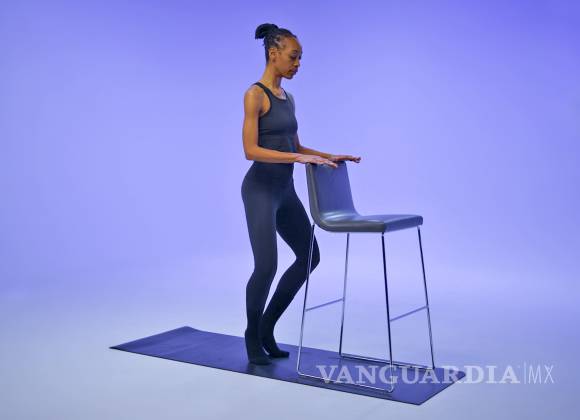 Colócate a un brazo de distancia de una silla, encimera u otro soporte, con las piernas juntas. Mientras te agarras al soporte, junta los talones y separa los dedos de los pies. Ahora levanta los talones unos centímetros del suelo. Dobla las rodillas, de modo que queden directamente sobre los pies en posición de plié. Contrae el tronco y baja el coxis unos centímetros.