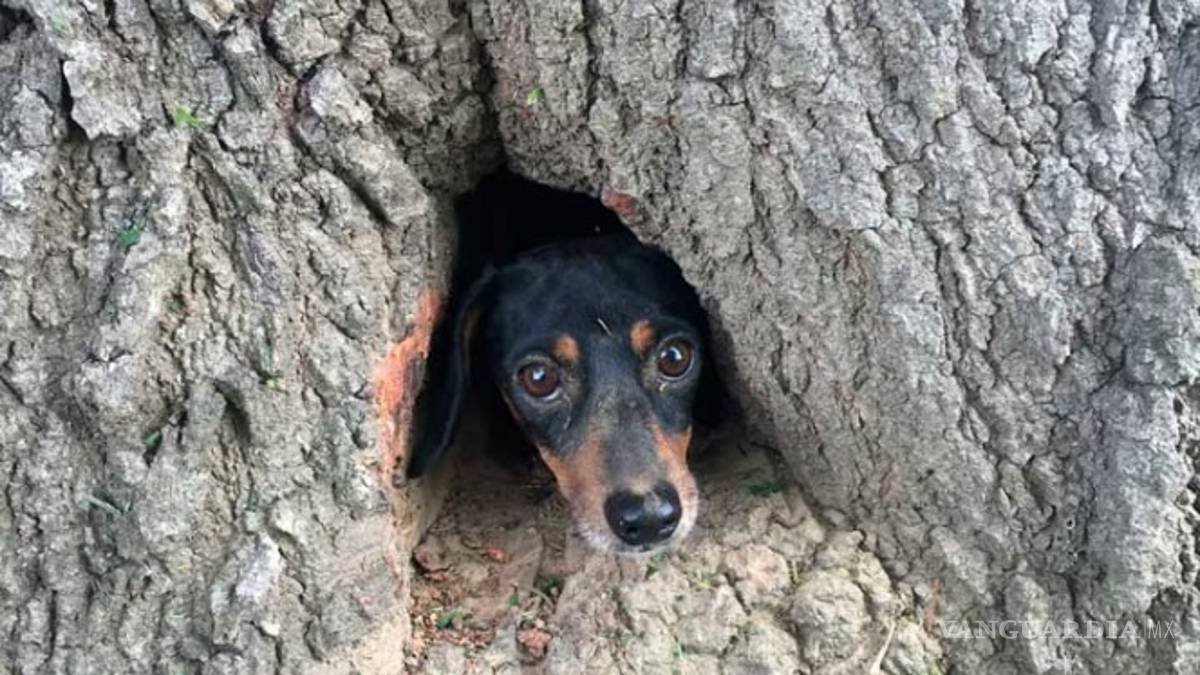 No, no era un pájaro atorado en un árbol, tampoco un gato; se trataba de un perro salchicha que tuvo que ser rescatado por un par de policías y un bombero cuando se quedó atrapado dentro del tronco.