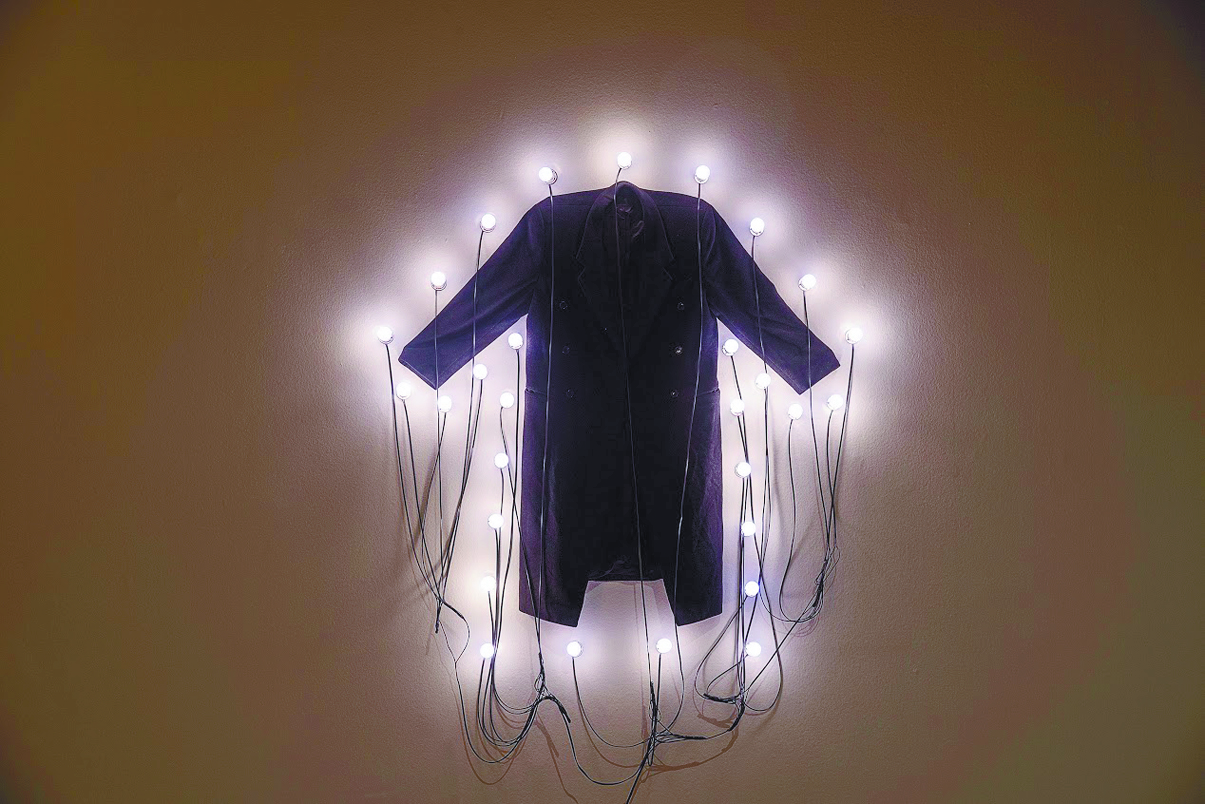 La muestra empieza con las piezas ‘La Manteau’ (2000) y Jewish School (1994); la primera consta de una gabardina negra rodeada de luces azules montadas en estructuras desordenadas de alambre mientras la segunda reposa a los lados y se compone de fotografías bajo la luz de una débil lámpara fluorescente.