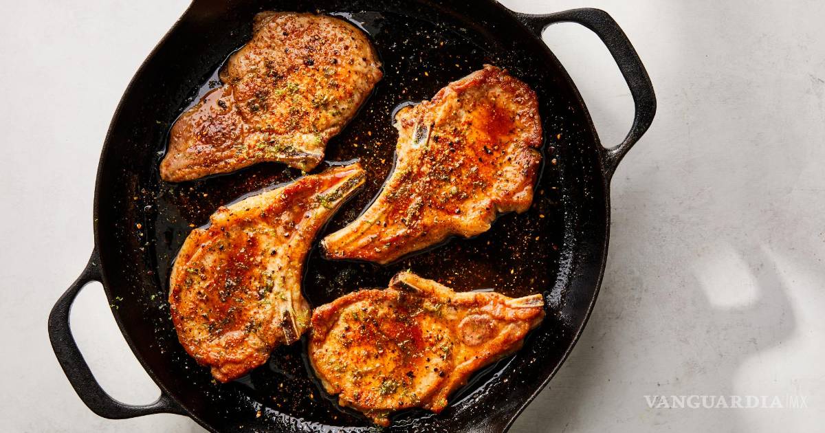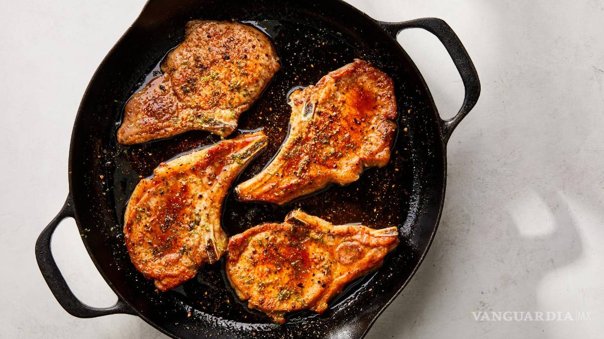 1. Haga dos cortes poco profundos en la capa de grasa de cada chuleta de cerdo para ayudar a que las chuletas se mantengan planas mientras se cocinan. Sazona las chuletas con sal y pimienta. (Si tiene tiempo y quiere asegurar una carne jugosa, refrigere en salmuera seca durante al menos 30 minutos o hasta 24 horas).