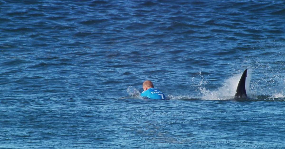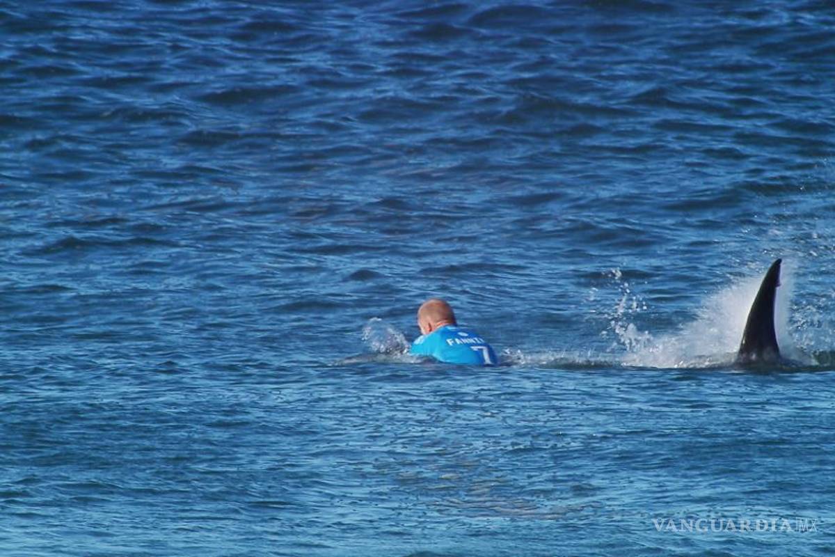 Primero, los comentaristas relatan su preocupación sobre las imágenes reales, pero de pronto emerge de las aguas un Fanning hercúleo que ha tomado al tiburón en sus brazos y lo exhibe sobre su cabeza como a un trofeo.