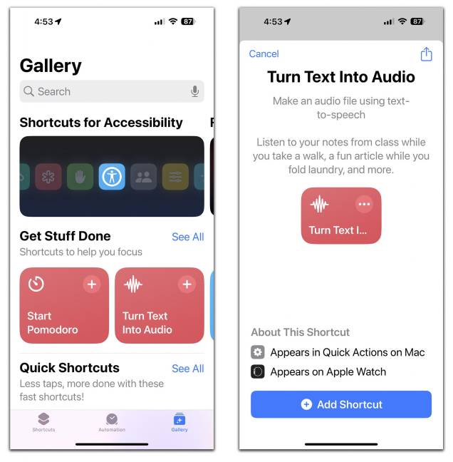 La aplicación incluye una gran colección de atajos listos para usar que hacen cosas como calcular el tiempo de viaje a reuniones o convertir texto en audio. Para ver los atajos incluidos, toca el icono de Galería en la parte inferior de la pantalla. Para añadir un atajo a tu colección personal, pulsa el botón + en su ficha.