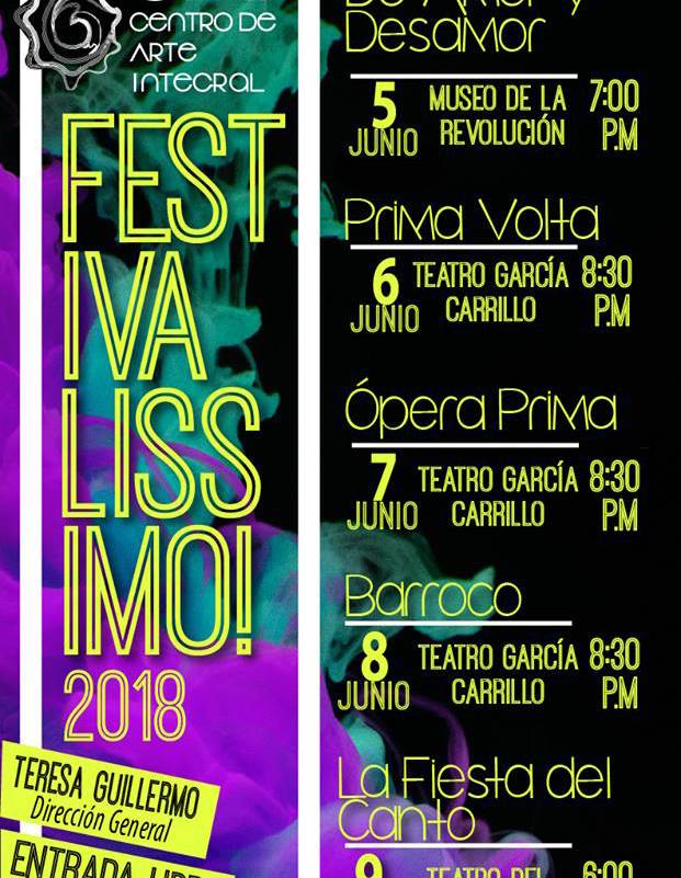 Del 5 al 9 de junio alumnos del Centro de Arte Integral (CAI) y del coro de la Secretaría de Cultura (SEC) celebrarán el canto con 5 conciertos en el Festivalissimo, dirigidos por la maestra Teresa Guillermo y acompañados al piano por Pablo Volbrecht.