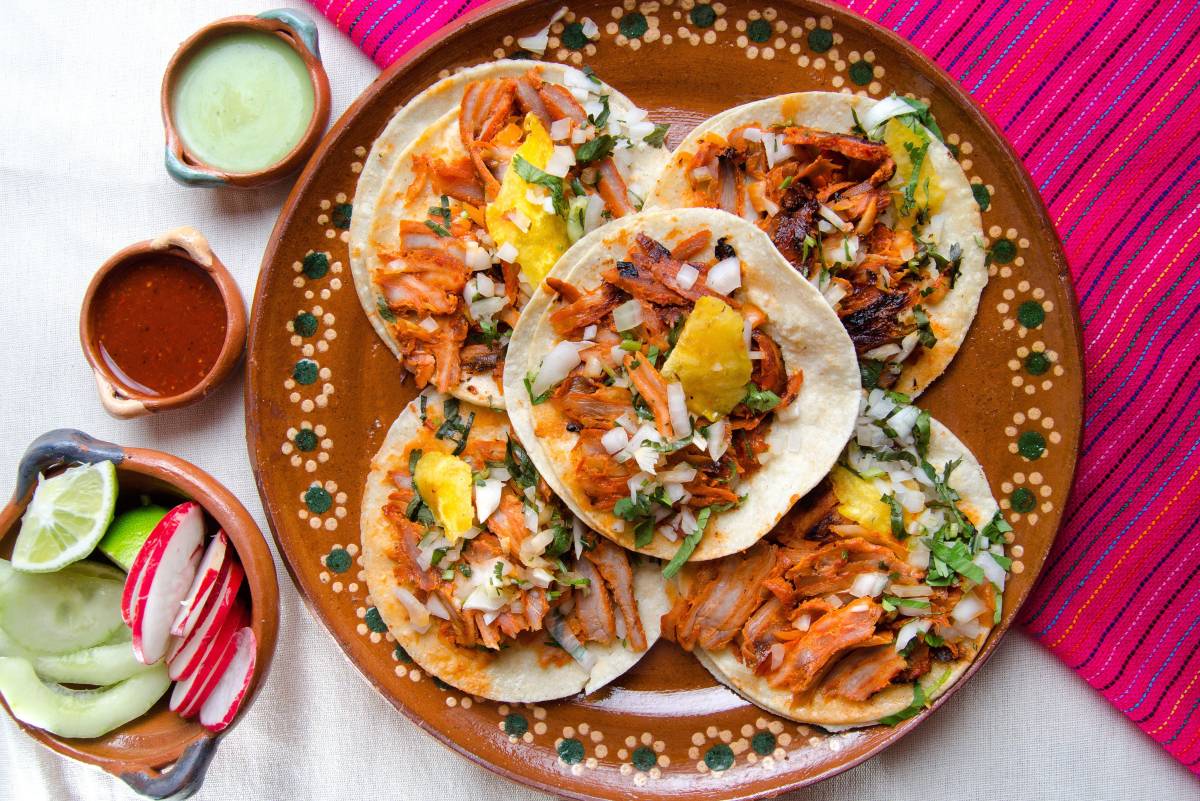 Acompañamientos: Se presenta en tortillas de maíz pequeñas y se complementa con cebolla picada, cilantro fresco y un toque de limón.